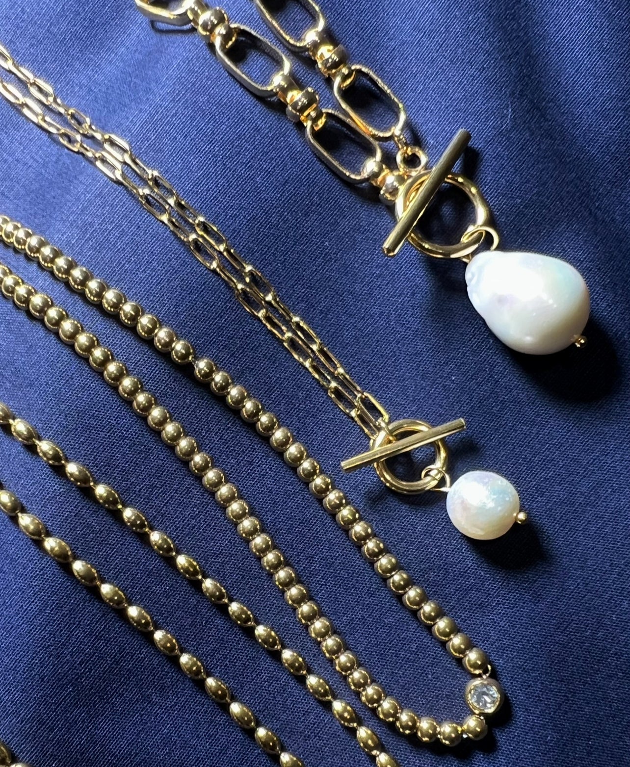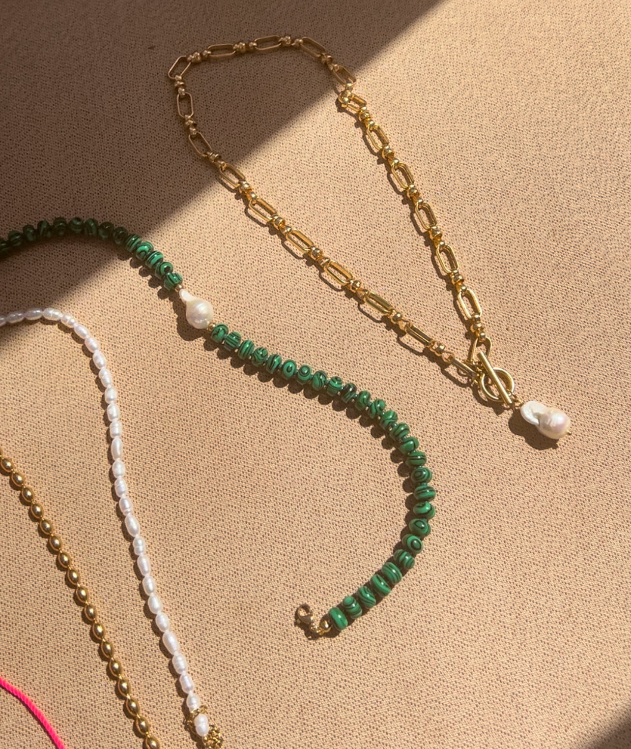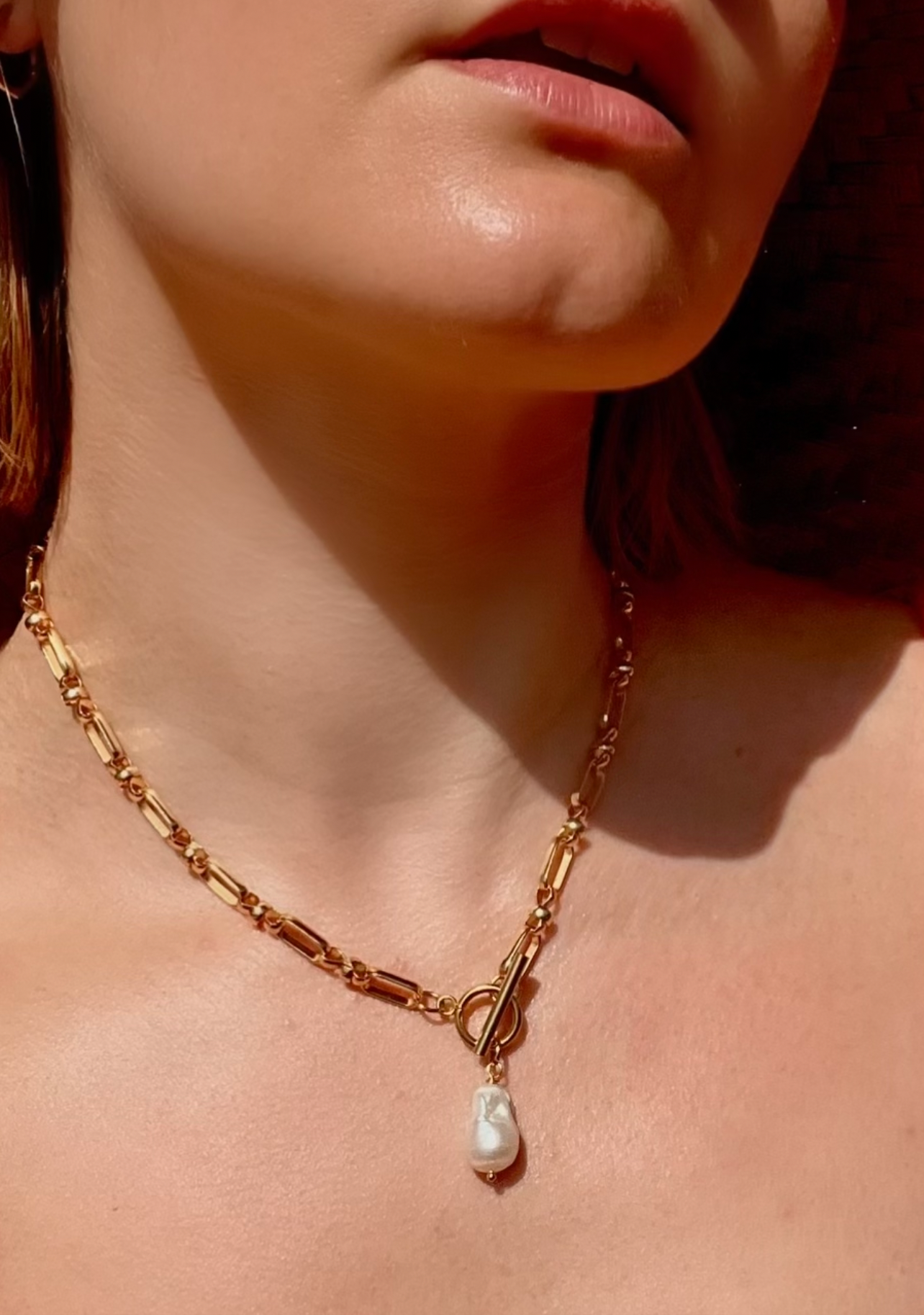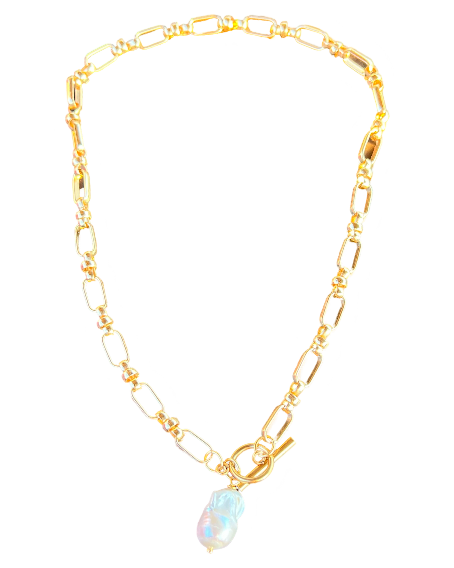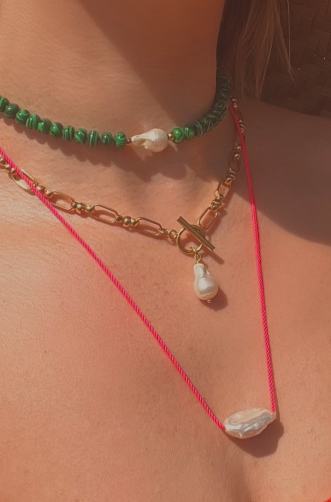 Our Celeste Pearl Necklace is a timeless statement of elegance, featuring an intricate -8k gold-plated chain and a striking central baroque pearl pendant. Designed for effortless wear, the thread-through fastening adds a refined touch. Wear it solo for understated sophistication or layer it with gemstone necklaces to elevate your look.