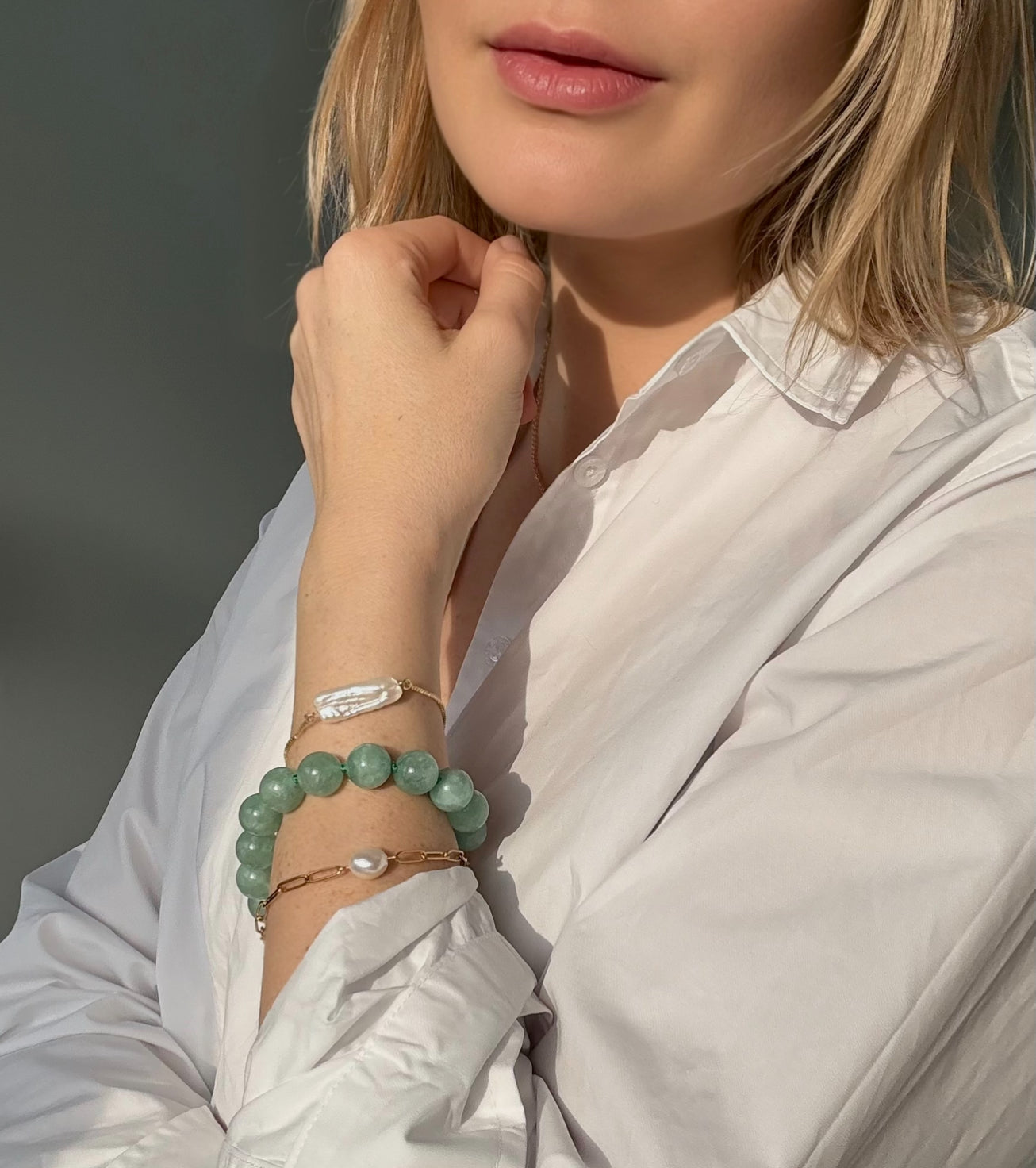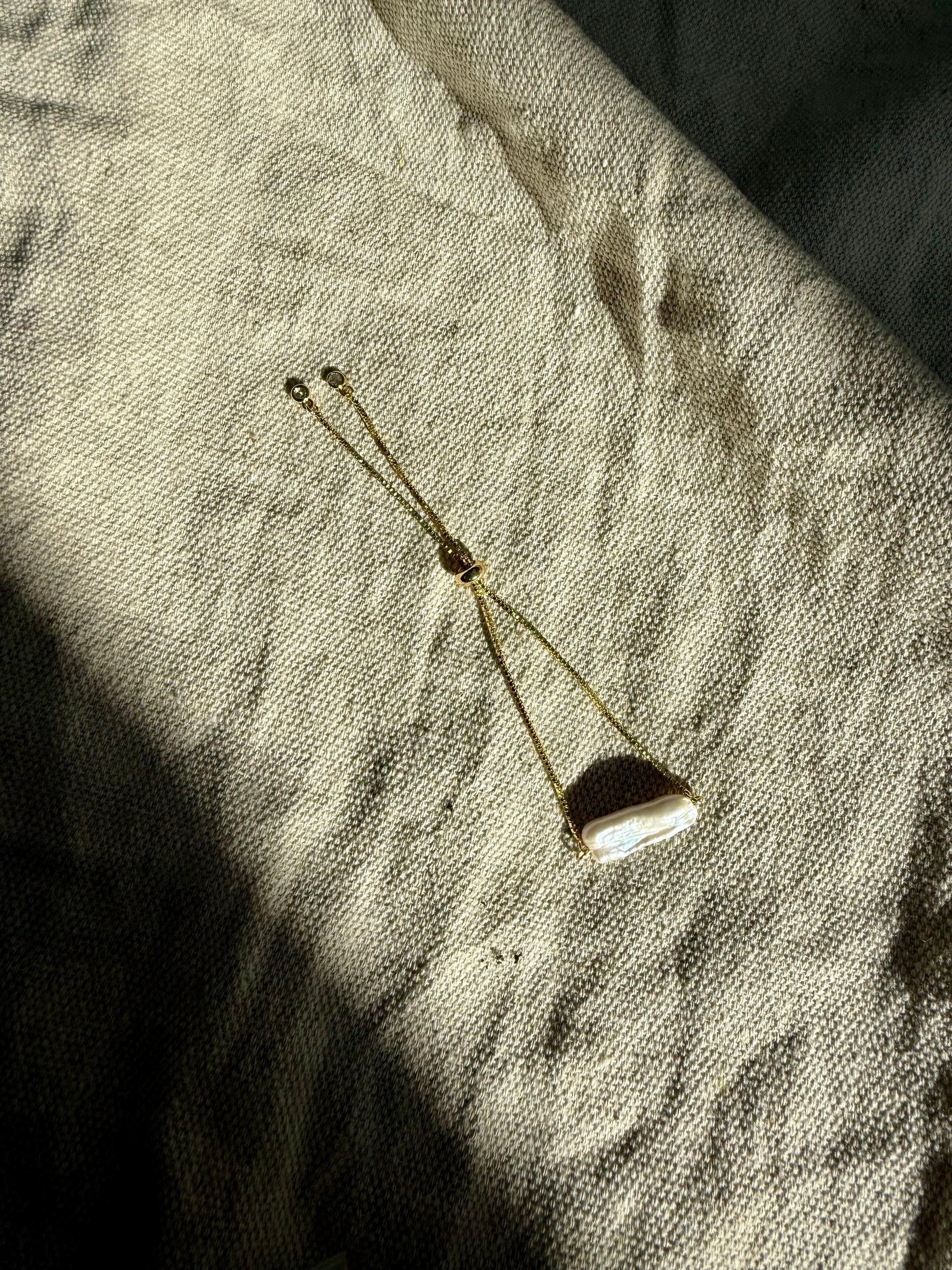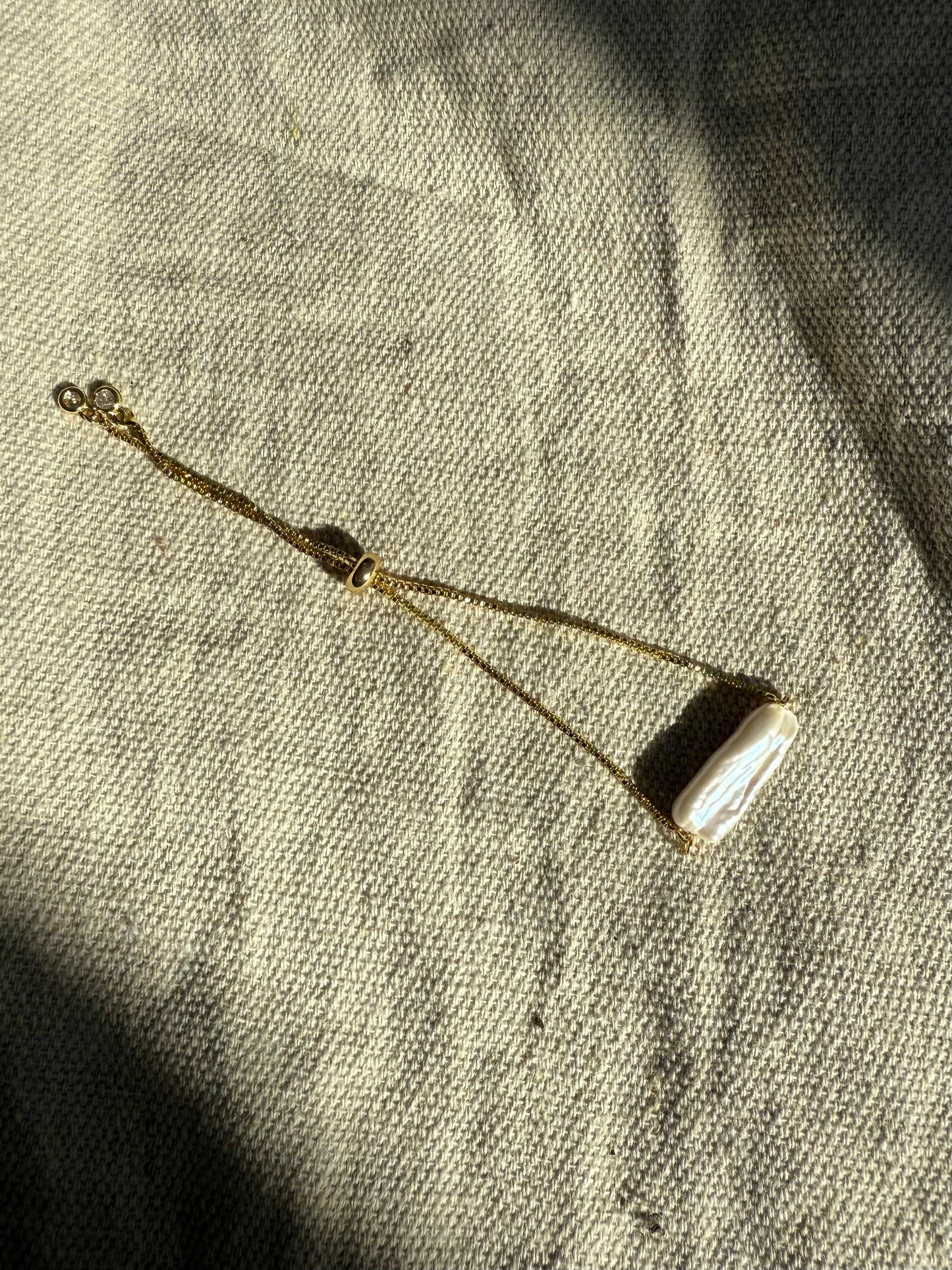 Expertly crafted with a gold plated snake chain and adorned with a stunning rectangular baroque pearl, the Hallie bracelet exudes elegance. Its adjustable slider closure allows for a perfect fit, while the small crystals on the chain add a touch of sparkle..