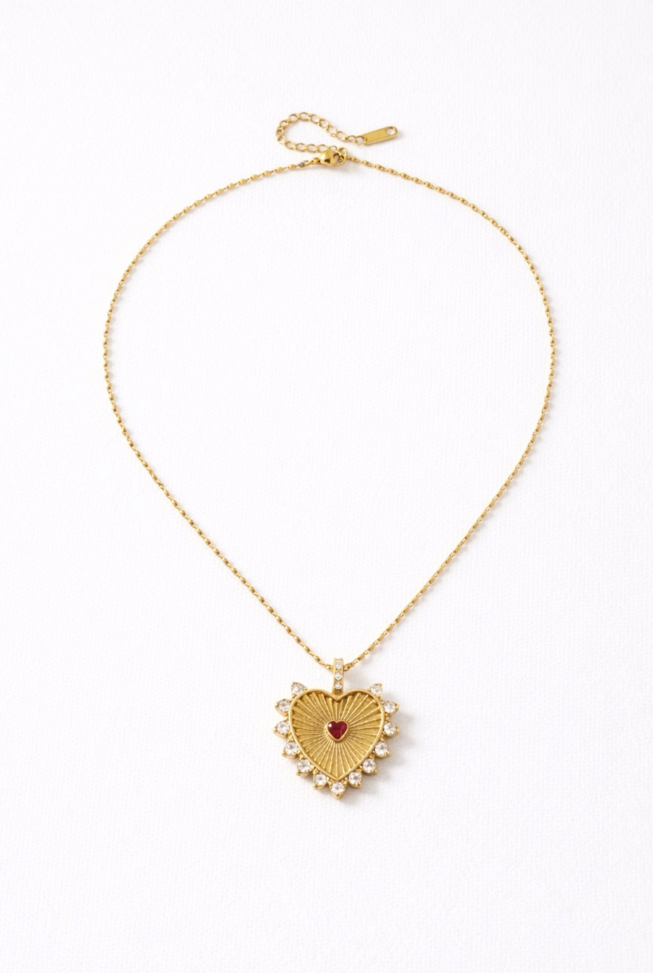 - Pendant: Sunburst heart with ruby-coloured centre stone and clear crystal detailing