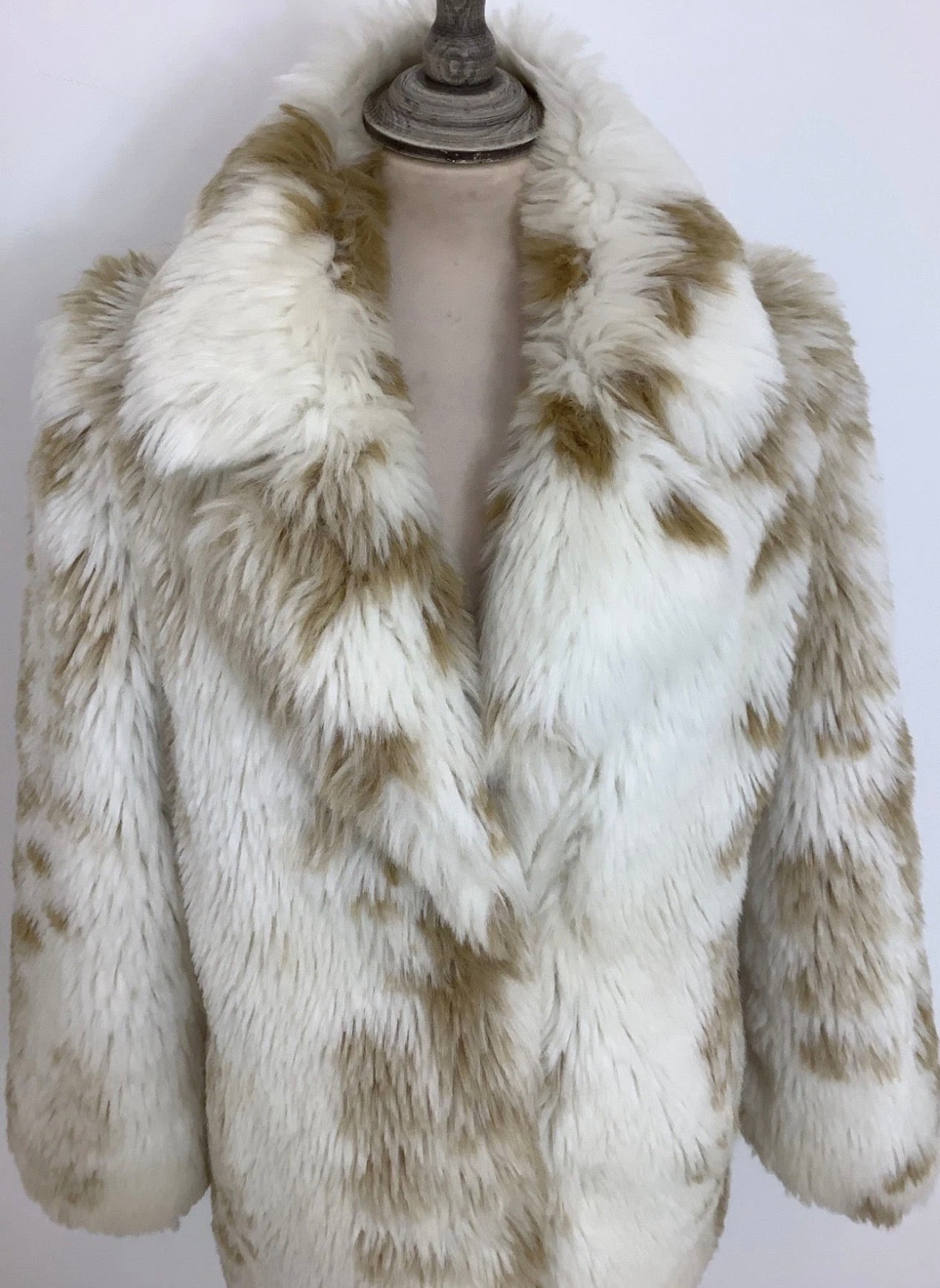 Simulated faux fur with silky lining. Two-tone cream and brown throughout. Pockets on both sides.