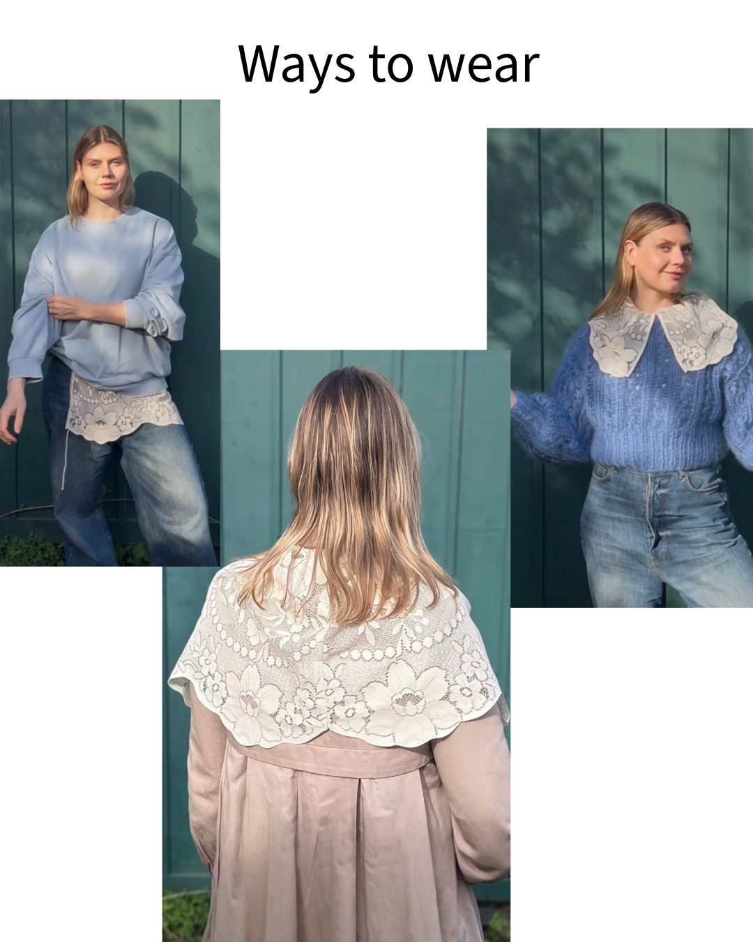 Reworking vintage laces preserves existing craftsmanship while giving it new life in a modern, wearable form. Each wrap is a small statement piece, designed to add interest without excess and to extend the life of the clothes you already own.